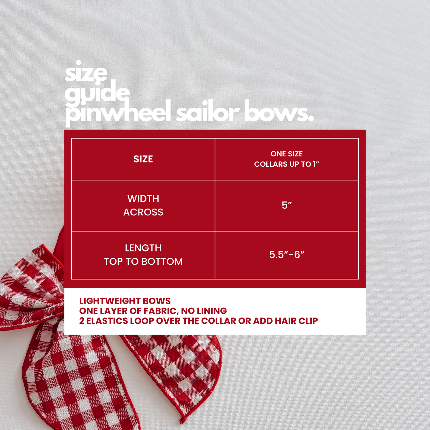 PINWHEEL SAILOR BOW ONE SIZE. Slip over the collar up to 1” (depending on thickness). Made with 2 built in elastics for extra stability. Lightweight pinwheel sailor bows, one size fits all